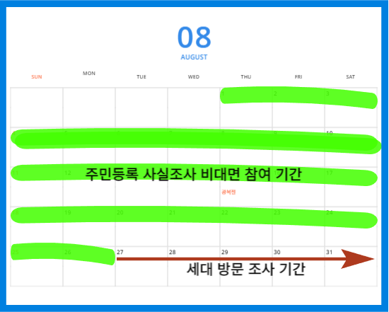 세대 방문 조사는 2024년 8월 27일부터 10월 15일까지 진행됩니다. 이 기간 동안 이·통장 및 읍·면·동 공무원이 각 가정을 직접 방문하여 조사를 실시합니다. 세대 방문 조사에는 비대면 조사에 참여하지 않은 세대와 특정 중점 조사 대상 세대가 포함됩니다. 중점 조사 대상에는 100세 이상의 고령자, 5년 이상 장기 거주 불명자, 고위험 복지 위기가구, 사망 의심자 그리고 장기 미인정 결석 및 학령기 미취학 아동이 포함된 세대입니다. 이러한 중점 조사 대상 세대는 비대면 조사에 참여하였더라도 재차 방문 조사가 이루어집니다.